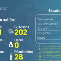 Nous avons enregistré 68 nouveaux cas positifs sur 6 267 tests réalisés, soit un taux de positivité de 1.1%, 47 personnes hospitalisées dont 23 en réanimation pour détresse respiratoire, 217 nouvelles guérisons et 00 décès.