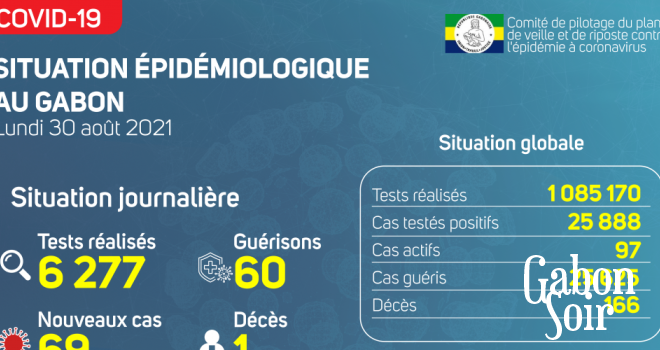 Nous avons enregistré 69 nouveaux cas positifs sur 6 277 tests réalisés, soit un taux de positivité de 1%, 28 personnes hospitalisées dont 11 en réanimation pour détresse respiratoire, 60 nouvelles guérisons et 01 nouveau décès à Libreville.