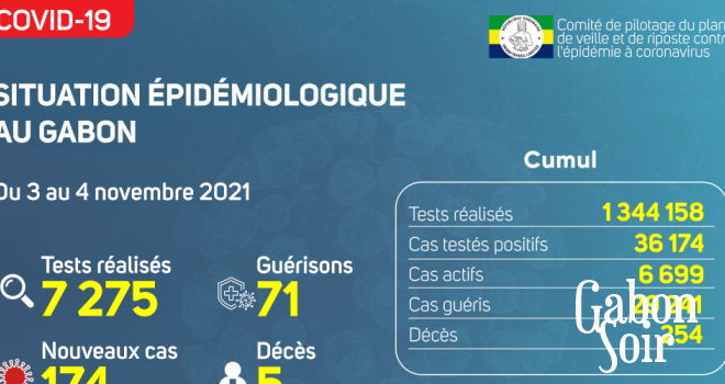 Nous avons enregistré 174 nouveaux cas positifs sur 7 275 tests réalisés, soit un taux de positivité de 2.4%, 95 personnes hospitalisées dont 24 en réanimation pour détresse respiratoire, 71 nouvelles guérisons et 05 nouveaux décès dont 04 à Libreville et 01 à Port Gentil.